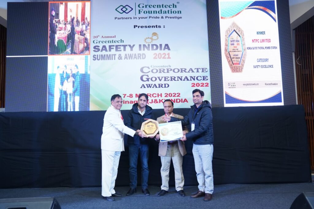 नमस्ते कोरबा :-: सुरक्षा के क्षेत्र में उत्कृष्ट प्रदर्शन करने के लिए एनटीपीसी कोरबा को ग्रीनटेक फाउंडेशन द्वारा सुरक्षा उत्कृष्टता पुरस्कार से सम्मानित किया गया। 20वां वार्षिक ग्रीनटेक सुरक्षा पुरस्कार 2021 को श्रीनगर (जम्मू-कश्मीर) के मेयर श्री जेनाब जुनैद अजीम मट्टू और ग्रीनटेक फाउंडेशन के प्रबंध निदेशक और सीईओ श्री कमलेश्वर शरण द्वारा प्रदान किया गया। एनटीपीसी कोरबा से श्री गवेन्द्र शर्मा (उप महाप्रबंधक – सुरक्षा) ने ये पुरुस्कार लिया।