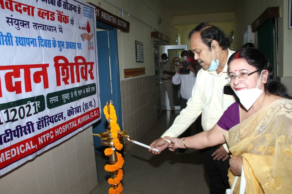 एनटीपीसी कोरबा में एनटीपीसी लिमिटेड के आगामी स्थापना दिवस के उपलक्ष में मेडिकल टीम द्वारा रक्तदान शिविर का आयोजन किया गया। ये आयोजन संवेदना ब्लड बैंक के सहयोग से किया गय। कार्यक्रम की शुरुआत एनटीपीसी कोरबा के कार्यकारी निदेशक श्री बिस्वरूप बसु एवं प्रेरित महिला समिति की अध्यक्ष श्रीमती निवेदिता बसु के कर कमलों द्वारा दीप प्रज्वलन से की गयी। तत्पश्चात श्री बिस्वरूप बासु एवं श्रीमती निवेदिता बासु ने रक्त दान कर रहे लोगो से मुलाक़ात की एवं उनकी सार्थक पहल की सराहना क। शिविर में एनटीपीसी कोरबा के वरिष्ठ अधिकारी गणन, यूनियन के सदस्य और मैत्री महिला समिति के सदस्य उपस्थित थे। रक्तदान शिविर में एनटीपीसी कोरबा के कर्मचारियों एवं केंद्रीय औद्योगिक सुरक्षा बल (कोरबा) सहित 44 लोगों ने चिकितस्क सुरक्षा के साथ अपना रक्तदान किया।