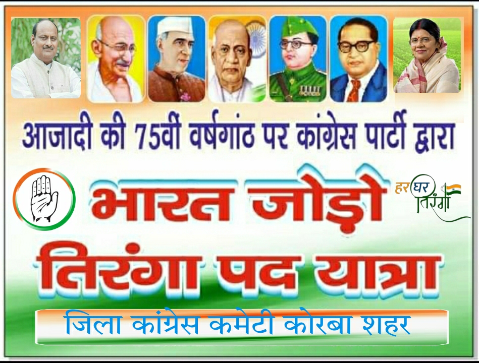 नमस्ते कोरबा:- अखिल भारतीय कांग्रेस कमेटी के निर्देश पर छत्तीसगढ़ प्रदेश के 90 विधानसभा क्षेत्रों में आजादी की 75वीं वर्षगांठ पर गौरव यात्रा (75 कि.मी. पदयात्रा)किया जा रहा है। कोरबा विधानसभा प्रभारी एवं प्रदेश के राजस्व मंत्री जयसिंह अग्रवाल के नेतृत्व में कोरबा विधान सभा अंतर्गत 75 किलोमीटर गौरव यात्रा (पदयात्रा) की जाएगी, जिसका शुभारंभ दिनांक 08 अगस्त सोमवार को प्रातः 10 बजे गांधी चौक कोरबा से होगा।