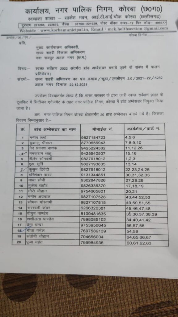 नमस्ते कोरबा :-: जिला कांग्रेस कमेटी कोरबा के मीडिया प्रभारी पीयूष पांडेय को मुख्य कार्यपालन अधिकारी. राज्य शहरी विकास अधिकरण नया रायपुर छ्.ग के द्वारा पत्र जारी कर नगर पालिक निगम कोरबा के स्वच्छ सर्वेक्षण 2022 बालकों जोन अंतर्गत वार्ड क्रमांक 35,36,37,38,39 में ब्रांड अम्बेसडर नियुक्त किया गया है। तो वही पीयूष पांडे की इस उपलब्धि पर जहां उनके इष्ट मित्रों व शुभचिंतकों तथा समर्थकों ने उन्हें मिलकर इस हेतु बधाई दी है तो वहीं कईयों ने उन्हें फोन कर अपनी बधाई व शुभकामनाएं प्रेषित की हैं,