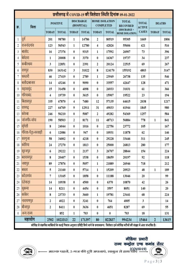 नमस्ते कोरबा :-: आज 09 जनवरी की स्थिति में प्रदेश की पॉजिटिविटी दर 8.05 प्रतिशत है। आज प्रदेश भर में हुए 31 हजार 071 सैंपलों की जांच में से 2502 व्यक्ति कोरोना संक्रमित पाए गए हैं।