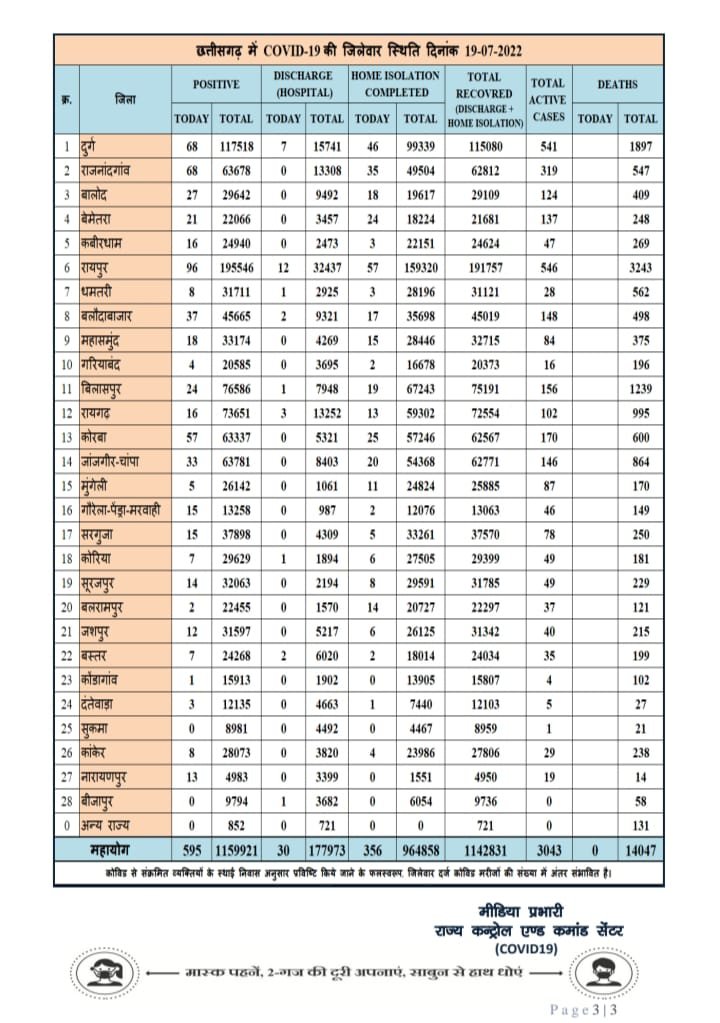 नमस्ते कोरबा :- प्रदेश में आज 19 जुलाई को 26 जिला कोंडागांव से 01, बलरामपुर से 02, दंतेवाड़ा से 03, गरियाबंद से 04, मुंगेली से 05 बस्तर एवं कोरिया से 07-07, धमतरी एवं कांकेर से 08-08, जशपुर से 12, नारायणपुर से 13, सूरजपुर से 14, गौरेला – पेंड्रा – मरवाही एवं सरगुजा से 15-15, कबीरधाम एवं रायगढ़ से 16-16, महासमुंद से 18, बेमेतरा से 21, बिलासपुर से 24, बालोद से 27, जांजगीर-चांपा से 33, बलौदाबाजार से 37, कोरबा से 57, राजनांदगांव एवं दुर्ग से 68-68, रायपुर से 96 कोरोना संक्रमित पाए गए तथा शेष जिलों में कोरोना का कोई नया मामला नहीं आया है।