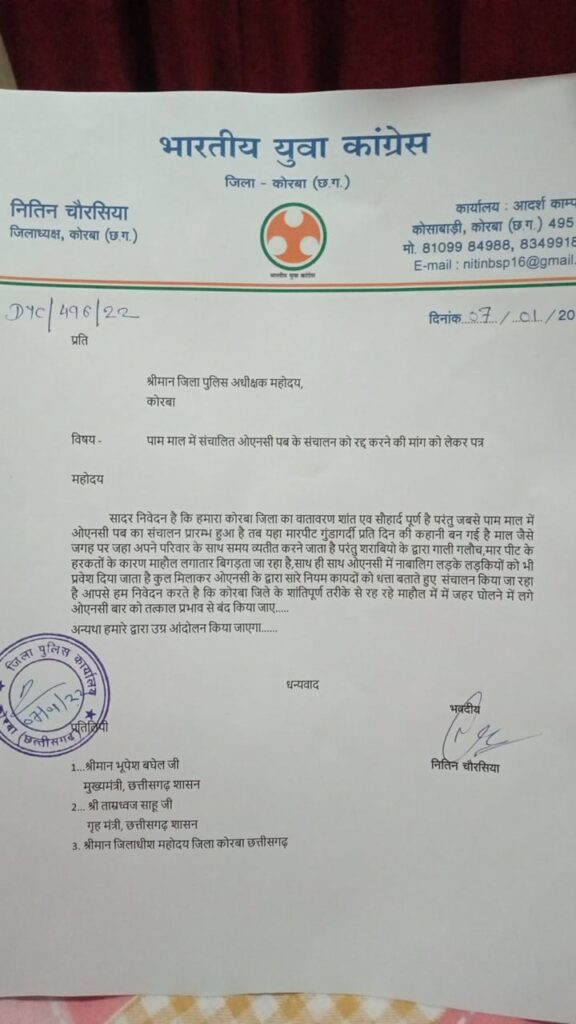 नमस्ते कोरबा : पाम माल में संचालित ओएनसी पब के संचालन को रद्द करने की मांग को लेकर आज युका जिला अध्यक्ष द्वारा जिला प्रशासन को ज्ञापन सौंपा कर पब बंद करने की मांग की गई ,,