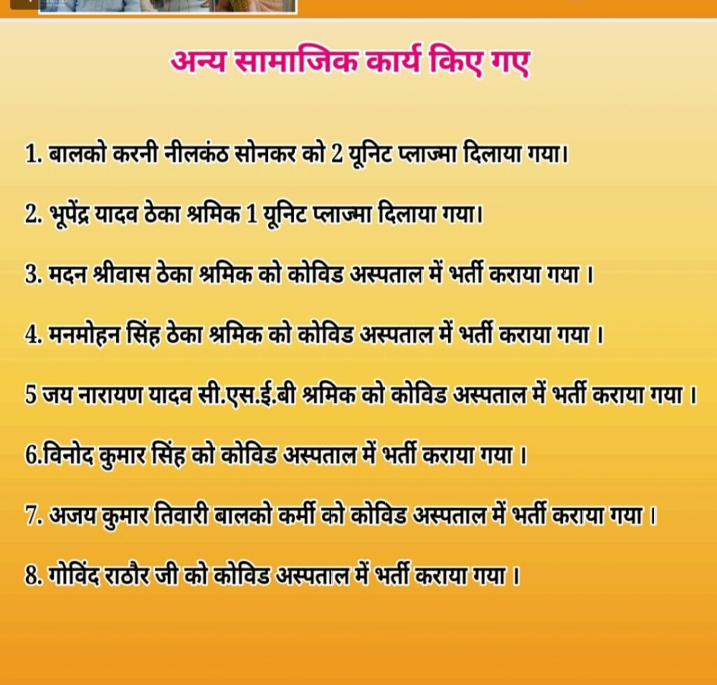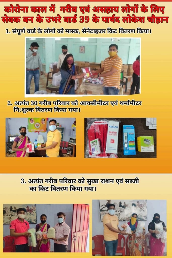 कोरोना काल मे वार्ड 39 के पार्षद-लोकेश्वर चौहान(लुक्की) वार्ड एव्म बाल्को क्षेत्र में लगातार गरीब एव्म असहाय लोगो के लिए सेवक बन कर उभरे है लगातार गरीब परिवार लोगो की सेवा किसी न किसी माध्यम से कर रहे है करीब lock down एक महीने होने वाला है इस दुःख की घड़ी में लगातार लोगो का सहयोग कर रहे है (1) सम्पूर्ण वार्ड में लगातार मास्क ,सेनेटाइजर, साबुन का किट वितरण किया जा रहा है (2)अत्यन्त गरीब परिवार जिसको आवश्यक है उन्हें ऑक्सिमिटर,थर्मामीटर दिया जा रहा है वार्ड में लगभग 30 लोगो को अभी तक निःशुल्क दिया जा चुकाहै (3) अत्यन्त गरीब परिवार ,रोज कमाने खाने वाले ,तिहाडी मजदूर लोगो को लगातार निःशुल्क राशन एव्म सब्जी वितरण किया जा रहा है (4) अत्यंत गरीब परिवार सामाजिक संगठन के सहियोग से निःशुल्क भोजन वितरण किया जा रहा है(5) वार्ड में लगातार बाल्को एव्म निगम के सहयोग से सेनेटाइजर किया जा रहा है (6) आवस्यक लोगो को निःशुल्क दवाई भी वितरित किया जा रहा है (7) लगातार लोगो को वैक्सिन लगाने हेतु घर घर पाम्पलेट के माध्यम से जागरूक किया जा रहा है (8) कोविड सेंटर में हेल्प डेस्क की स्थापना की गई है ताकि वैक्सिन लगाने वालों को कोई प्रॉब्लम न हो,,(9) सेवा की संगठन के रूप में बाल्को के 2 लोगो को प्लाज्मा यूनिट का सहयोग किया गया (10) साथ ही साथ अन्य कोविड मरीज की सहयता लगतार की जा रही है ताकि उनको किसी भी प्रकार की समस्या उत्पन्न न हो (1) कोविड मरीज के यंहा सब्जी,एम अन्य आवस्यक सामग्री पहुचाने की सहयता की जा रही है