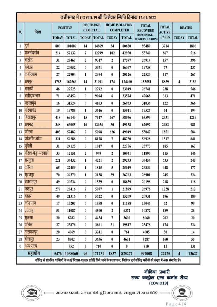 नमस्ते कोरबा :-: छत्तीसगढ़ एक बार फिर कोरोना का प्रकोप झेल रहा है। कोरोना वायरस के मामलों में भारी इजाफा देखने को मिल रहा है। अब तक 10 लाख से ज्यादा लोग संक्रमित हो चुके हैं। आज 5476 नए मरीज मिलने की पुष्टि हुई है। अब छत्तीसगढ़ में कुल एक्टिव मरीज 27425 हो गए हैं।
