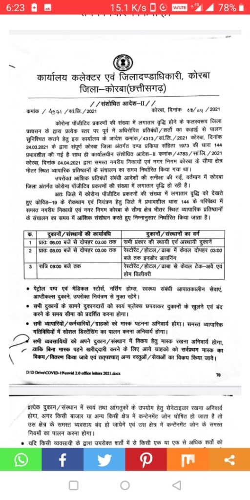 नमस्ते कोरबा:: कोरबा जिले में भी बढ़ते कोरोना संक्रमण को देखते हुए जिला प्रशासन के द्वारा दुकानों के समय में फिर से परिवर्तन किया गया है अब दुकानें दोपहर 3:00 बजे तक ही खुल सकेगी दुकान संचालनकर्ता को शासन द्वारा निर्धारित कोरोना प्रोटोकॉल का पूर्ण रुप से पालन करना होगा