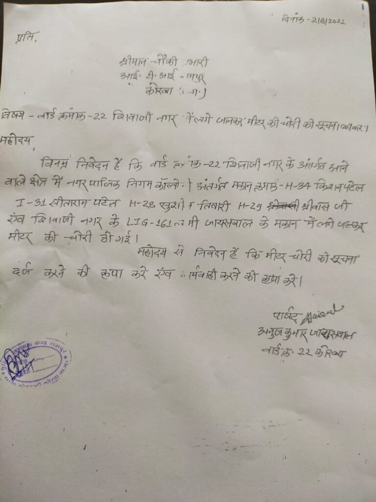 नमस्ते कोरबा :-: शहर के शिवाजी नगर वार्ड क्रमांक 22 से अजीबोगरीब चोरी का मामला सामने आया है चोरों ने घर पर लगे पानी मीटर की चोरी की है, अगर आपके घर पर नगर निगम से जल आपूर्ति हेतु मीटर लगाया गया है तो थोड़ा संभल कर रहे, बीती रात शिवाजी नगर वार्ड क्रमांक 22 में अज्ञात चोरों ने वार्ड के 5 घरों में जलापूर्ति हेतु लगाए हुए मीटरों की चोरी को अंजाम दिया है वार्ड पार्षद अनुज जायसवाल द्वारा इसकी लिखित शिकायत रामपुर चौकी में की गई है , वार्ड पार्षद के द्वारा रामपुर पुलिस चौकी के द्वारा क्षेत्र में पुलिस गश्त बढ़ाने की भी गुजारिश की गई है जिससे कि ऐसे असामाजिक तत्वों पर लगाम लग सके ,
