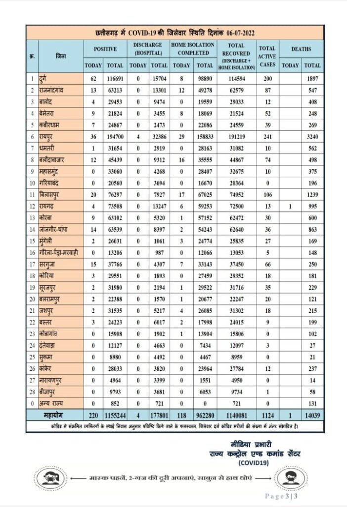 आज 06 जुलाई की स्थिति में प्रदेश की पॉजिटिविटी दर 2.27 प्रतिशत है। आज प्रदेश भर में हुए 9 हजार 697 सैंपलों की जांच में 220 व्यक्ति कोरोना संक्रमित पाए गए हैं। प्रदेश के 19 जिलों से 220 कोरोना संक्रमित पाए गए तथा शेष जिलों में आज कोरोना का कोई नया मामला नहीं आया।