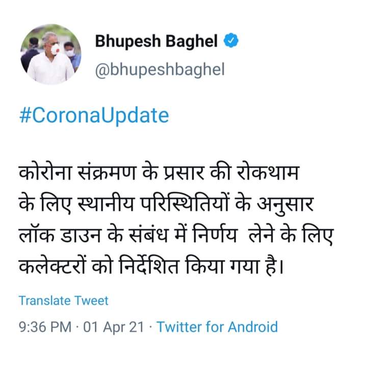 नमस्ते कोरबा ::बीते 10 दिनों से छत्तीसगढ़ के कई जिलों में कोरोना संक्रमण की रफ़्तार देख अब लॉकडाउन लगने के आसार तेज हो गये हैं। मुख्यमंत्री भूपेश बघेल ने सभी कलेक्टरों को निर्देश दिया है कि वे अपने जिलों में कोरोना संक्रमण के हालात के आधार पर लॉकडाउन लगा सकते हैं। मुख्यमंत्री भूपेश बघेल ने ट्वीट कर इस बाबत जानकारी भी दी है। ज्ञातव्य हो कि पिछले दो दिनों से कोरोना प्रदेश में लगातार रिकार्ड तोड़ रहा है