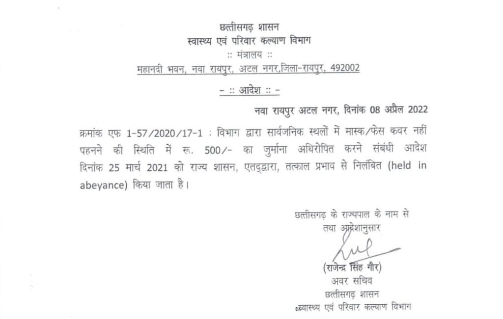 इस संबंध में आदेश जारी कर दिया गया है. अधिकारियों ने बताया कि राज्य के स्वास्थ्य एवं परिवार कल्याण विभाग ने मास्क नहीं पहनने पर लगने वाले ​जुर्माने को तत्काल प्रभाव से निलंबित करने के संबंध में आदेश जारी किया है.