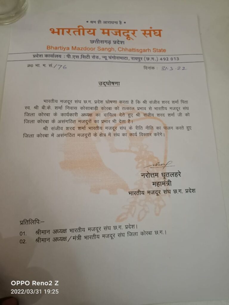 भारतीय मजदूर संघ छ.ग. प्रदेश महामंत्री ने घोषणा पत्र जारी कर छत्तीसगढ़ श्रमिक एकता संघ को दायित्व दिया गया, घोषणा पत्र में लिखित के रूप में प्रकाशित कि गई इसमें स्पष्ट रूप से कहा गया है कि संजीव शरद शर्मा पिता स्व. बी.के. शर्मा निवास कोसाबाड़ी कोरबा को तत्काल प्रभाव से भारतीय मजदूर संघ जिला कोरबा के कार्यकारी अध्यक्ष का दायित्व देते हुए संजीव शरद शर्मा को जिला कोरबा के असंगठित मजदुरों का प्रभार भी देता है। संजीव शरद शर्मा भारतीय मजदूर संघ के रीति नीति का पालन करते हुए जिला कोरबा में असंगठित मजदुरों के क्षेत्र में संध का कार्य विस्तार करेंगे। जिसके बाद छत्तीसगढ़ श्रमिक एकता संघ के पदाधिकारी एवं श्रमिकों के चेहरों में खुशी का अलग ही लहर देखने को मिली और सब एक दूसरे को बधाई देते हुए नजर आए,