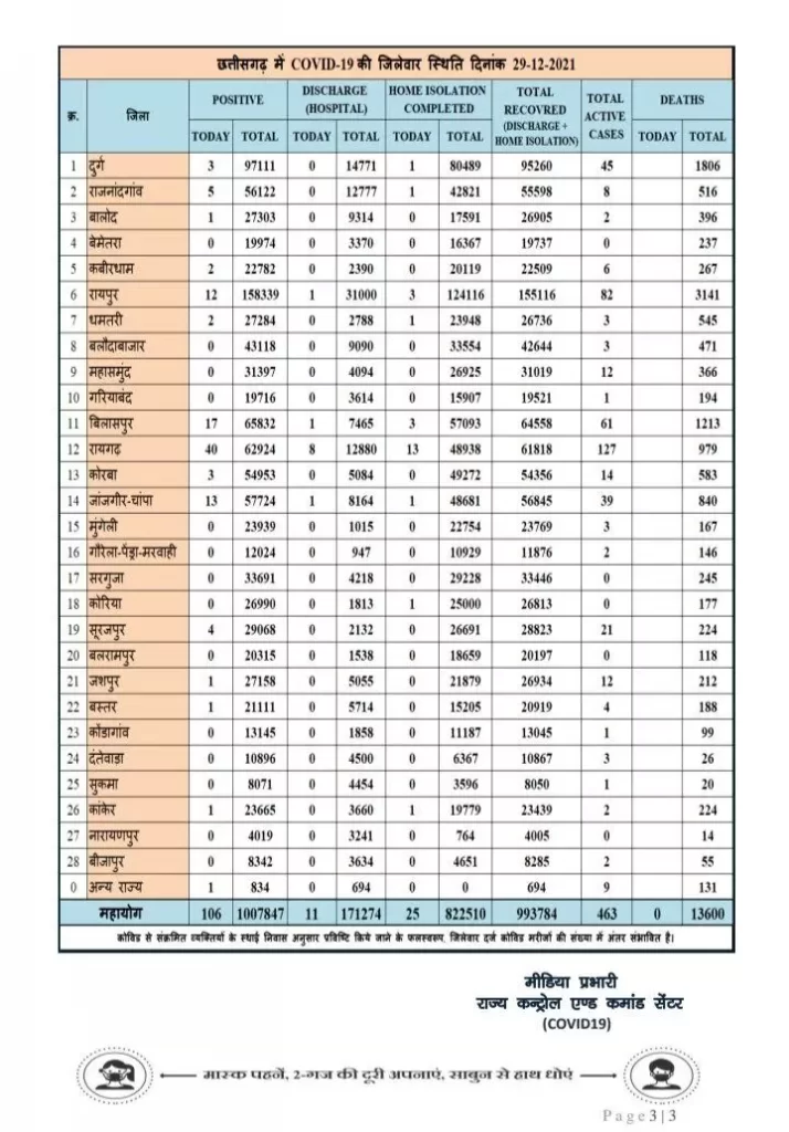 कोरोना वायरस को लेकर छत्तीसगढ़ स्वास्थ्य विभाग ने मेडिकल बुलेटिन जारी किया है. बुलेटिन के मुताबिक प्रदेश में आज 106 नए कोरोना पॉजिटिव मरीज़ों की पहचान की गई है. वहीं 36 मरीज़ स्वस्थ होने के उपरांत डिस्चार्ज/रिकवर्ड हुए। वही राज्य में एक भी कोरोना संक्रमित मरीजों की मौत नहीं हुई