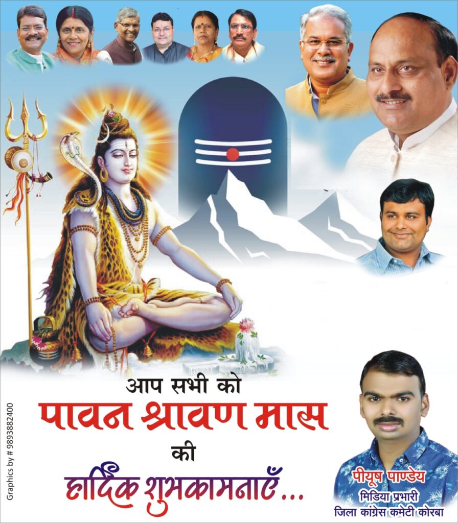 नमस्ते कोरबा :: जिला कांग्रेस कमेटी कोरबा के मीडिया प्रभारी पीयूष पांडेय ने श्रावण मास के प्रारंभ और प्रथम सोमवार के प्रारंभ होने पर जिलेवासियों को बधाई एवं शुभकामनाएं दी है।