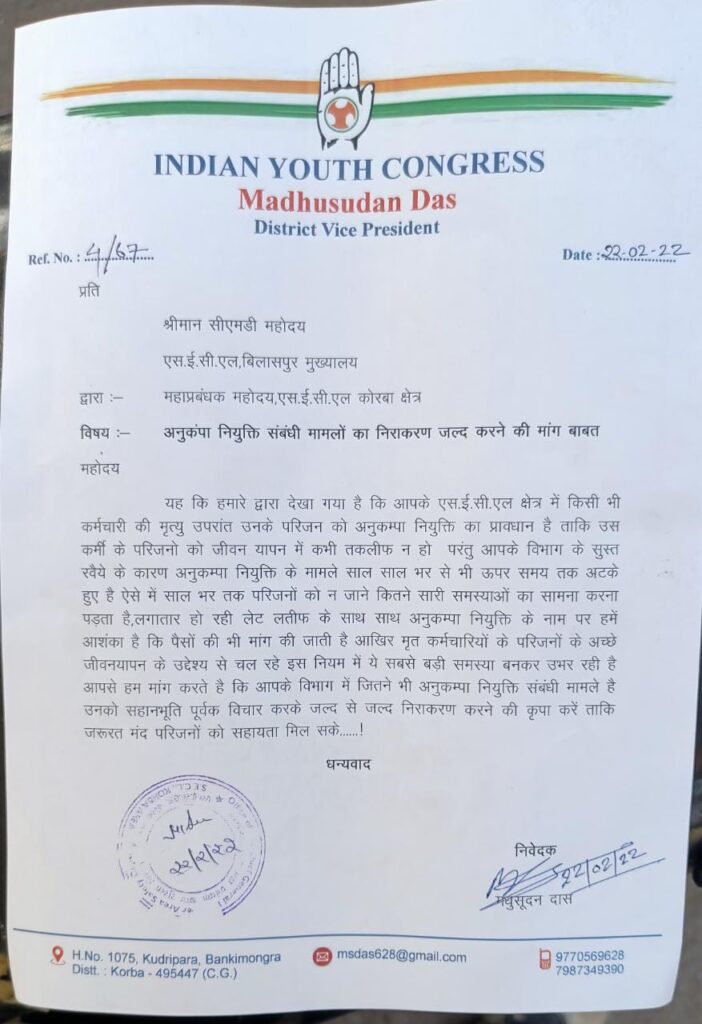 युवा कांग्रेस जिला कोरबा द्वारा युवा कांग्रेस जिला उपाध्यक्ष मधुसूदन दास के नेतृत्व में एसईसीएल क्षेत्र में अनुकंपा नियुक्ति के सम्बंद में हो रहे देरी को लेकर सीएमडी,एसईसीएल बिलासपुर मुख्यालय के नाम का पत्र सीजीएम कोरबा को सौपा गया एव मांग की गई कि एसईसीएल क्षेत्र में जितने भी अनुकम्पा नियुक्ति संबंधित मामले है जल्द से जल्द उनका निराकरण किया जाए एव मृत कर्मचारियों के परिजनों को नौकरी प्रदान किया जाए…!!