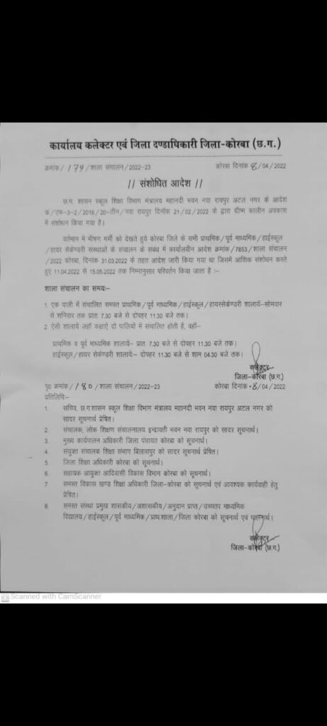 कोरबा 09 अप्रेल 2022/वर्तमान में भीषण गर्मी को देखते हुए कोरबा जिले के सभी प्राथमिक, पूर्व माध्यमिक, हाई स्कूल और हायर सेकेण्डरी स्कूलों के संचालन समय में संशोधन किया गया है। इस संबंध में कलेक्टर श्रीमती रानू साहू ने जरूरी आदेश जारी कर दिए हैं। जारी आदेशानुसार एक पाली में संचालित सभी प्राथमिक, पूर्व माध्यमिक, हाई स्कूल और हायर सेकेण्डरी स्कूल सोमवार से शनिवार तक सुबह 7.30 बजे से 11.30 बजे तक लगेंगी। इसी प्रकार दो पालियों में संचालित शालाओं में प्राथमिक एवं पूर्व माध्यमिक कक्षाएं सुबह 7.30 बजे से 11.30 बजे तक और हाई स्कूल व हायर सेकेण्डरी कक्षाएं सुबह 11.30 बजे शाम 4.30 बजे तक संचालित होंगी। उपरोक्त समय संशोधन 11 अप्रेल 2022 से 15 मई 2022 तक लागू रहेगा।