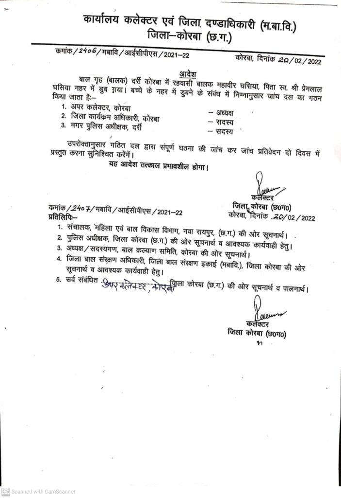 कोरबा 20 फरवरी 2022/ दर्री स्थित बाल गृह में रहवासी बालक के नहर में डूबने के संबंध में कलेक्टर श्रीमती रानू साहू ने जांच दल गठित कर दी है। साथ ही बाल गृह संचालित करने वाले एनजीओ के जिम्मेदारों पर भी कारवाई करने के निर्देश दिए है। जांच दल 2 दिन में संपूर्ण घटना की जांच कर प्रतिवेदन सौंपेगी। जांच दल में अपर कलेक्टर श्री सुनील नायक, जिला कार्यक्रम अधिकारी महिला एवं बाल विकास विभाग श्री एमडी नायक एवं नगर पुलिस अधीक्षक दर्री सुश्री लितेश सिंह शामिल हैं। उल्लेखनीय है कि दर्री बालगृह में रहवासी बालक महावीर घसिया पिता स्वर्गीय श्री प्रेम लाल घसिया नहर में डूब गया है। बालक के नहर में डूबने की संपूर्ण घटना की जांच करने कलेक्टर ने समिति गठित की है।