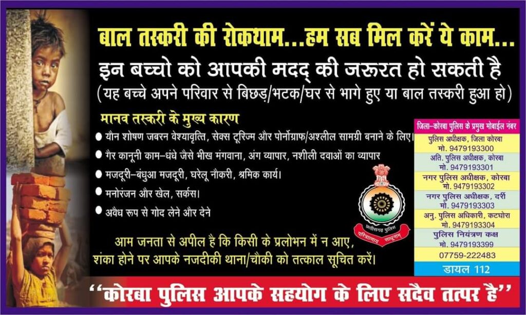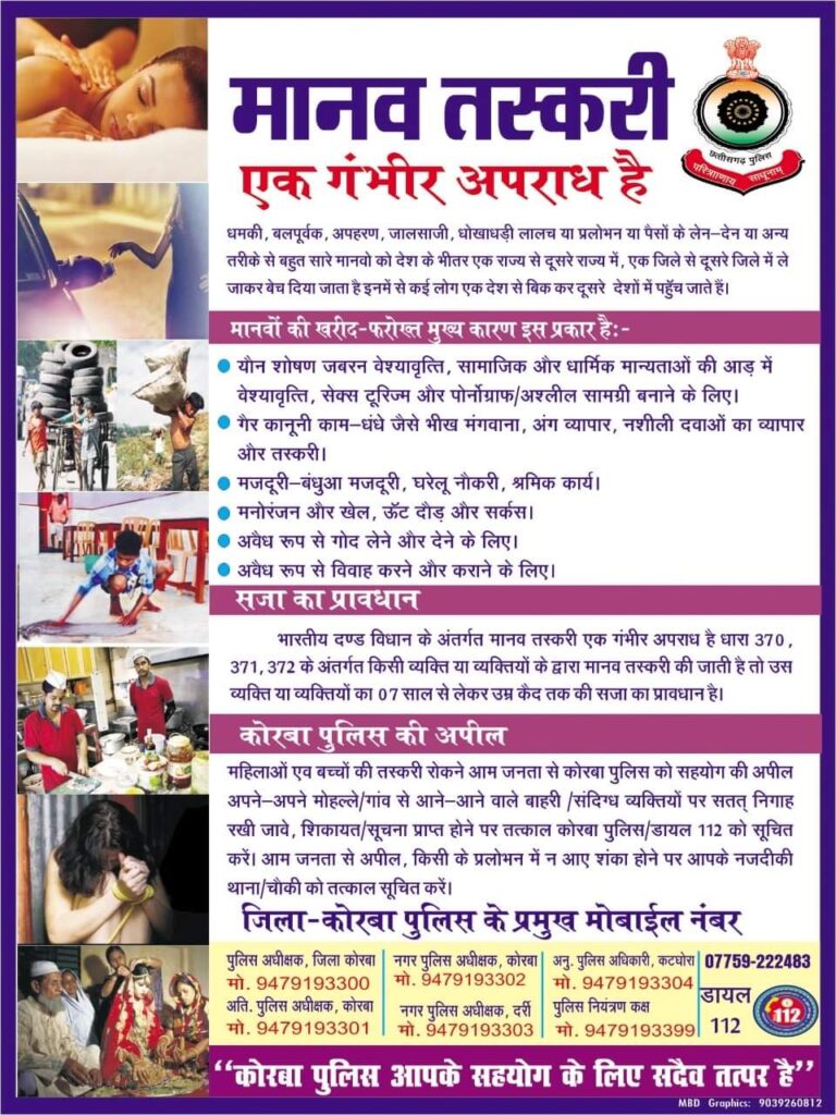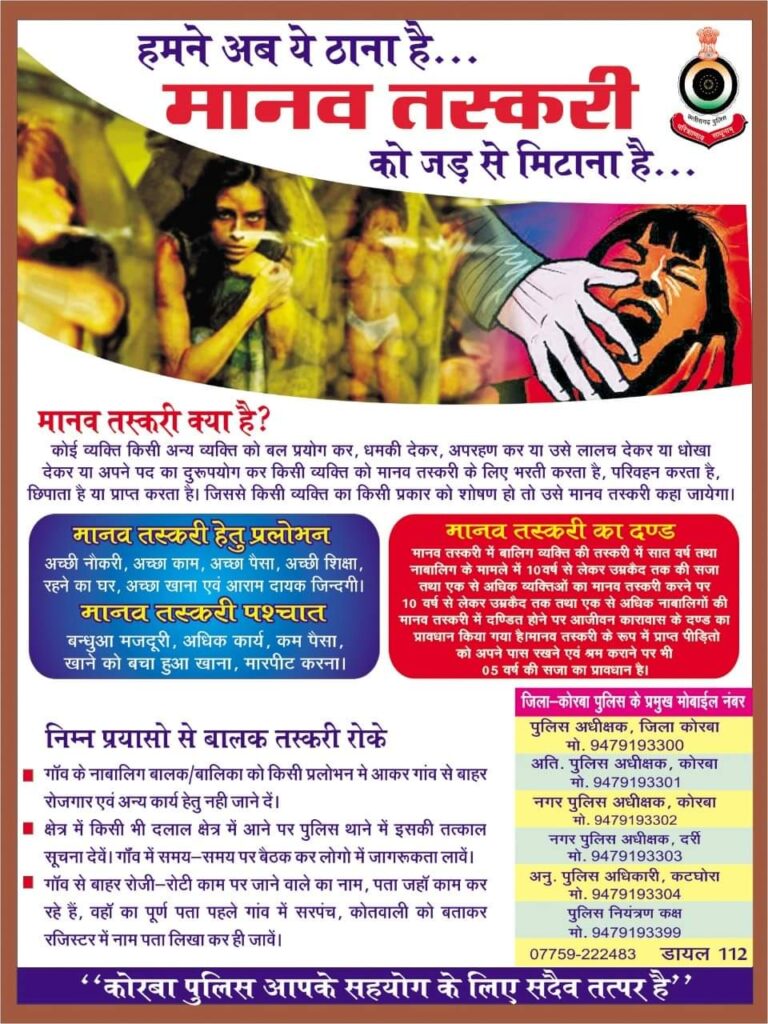 नमस्ते कोरबा :: जिला पुलिस कोरबा के द्वारा गंभीर अपराधों में से एक मानव तस्करी को रोकने के लिए सोशल मीडिया के माध्यम से आम जनों को इस अपराध की गंभीरता को समझाते हुए कैसे इसे रोका जा सकता है, फ्लेक्स और बैनर के माध्यम से यह बताया जा रहा है. और लोगों से अपील की जा रही है जिला पुलिस का सहयोग करने के लिए, जिला पुलिस के द्वारा फ्लेक्स और बैनर पर वरिष्ठ पुलिस अधिकारियों के मोबाइल नंबर भी जारी किए गए हैं जिससे किसी भी प्रकार के परेशानी होने पर उनसे सीधे संपर्क किया जा सके