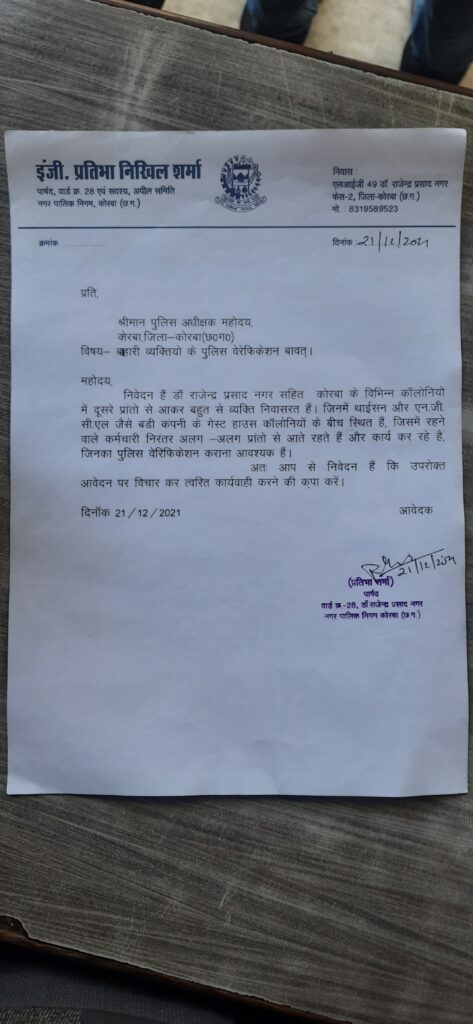 नमस्ते कोरबा :-: वार्ड क्रमांक 28 के पार्षद प्रतिभा निखिल शर्मा द्वारा कोरबा पुलिस अधीक्षक को लिखे आवेदन में कहा गया है कि कोरबा के विभिन्न संयंत्रों में दूसरे राज्यों से बड़ी संख्या में मजदूरों का आना जाना लगा हुआ है, जोकि थाईसन और एन जी सीएल जैसे बड़ी कंपनियों में कार्यरत हैं और जिनका गेस्ट हाउस शहर के विभिन्न इलाकों में बनी कॉलोनियों के मध्य में स्थित है, आवेदन में यह भी कहा गया है कि कोरोना के नए संक्रमण के मद्देनजर अगर एक भी मजदूर या अधिकारी कोरोना पॉजिटिव आता है तो पूरे कॉलोनी में संक्रमण का डर रहेगा, डॉ राजेंद्र प्रसाद नगर स्थित एक कंपनी के निजी गेस्ट हाउस में रह रहे कंपनी के युवाओं द्वारा कॉलोनी निवासियों को बेवजह का परेशान भी किया जा रहा है इन सब बातों को देखते हुए संयंत्रों में कार्यरत विभिन्न कंपनियों के सभी कामगारों का पुलिस वेरिफिकेशन जरूरी है जिससे कि भविष्य में कुछ अप्रिय घटना होने पर इन पर लगाम कसा जा सके