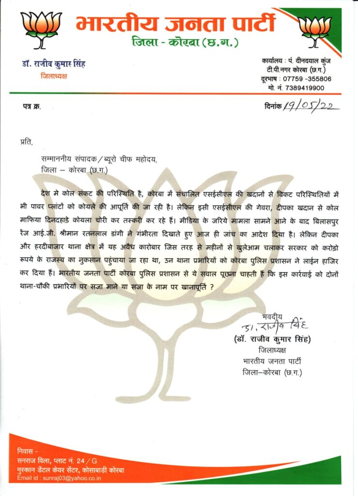 नमस्ते कोरबा :-भारतीय जनता पार्टी जिला कोरबा के जिलाध्यक्ष डॉ राजीव सिंह ने प्रेस नोट जारी करते हुए कहा कि देश में कोल संकट की परिस्थिति है।कोरबा में संचालित एसईसीएल की खदानों से विकट परिस्थितियों में भी पावर प्लांटों को कोयले की आपूर्ति की जा रही है। लेकिन इसी एसईसीएल की गेवरा,दीपका खदान से कोल माफिया दिनदहाड़े कोयला चोरी कर तस्करी कर रहे हैं। मीडिया के जरिये मामला सामने आने के बाद बिलासपुर रेंज आई.जी. श्रीमान रतनलाल डांगी ने गंभीरता दिखाते हुए जांच का आदेश दिया है। लेकिन दीपका और हरदीबाजार थाना क्षेत्र में यह अवैध कारोबार जिस तरह से महीनों से खुलेआम चलाकर सरकार को करोड़ो रूपये के राजस्व का नुकसान पहुंचाया जा रहा था,उन थाना प्रभारियों को कोरबा पुलिस प्रशासन ने लाईन हाजिर कर दिया है।भारतीय जनता पार्टी कोरबा पुलिस प्रशासन से ये सवाल पूछना चाहती हैं कि इस कार्रवाई को दोनों थाना चौकी प्रभारियों पर सजा माने या सजा के नाम पर खानापूर्ति ?
