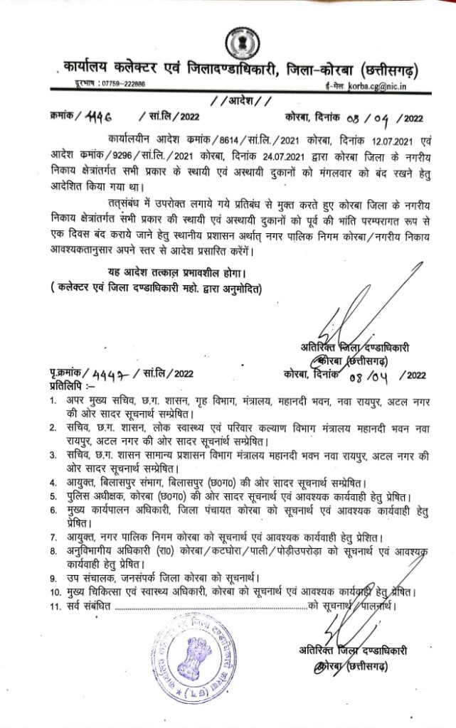 कोरबा 08 अप्रैल 2022/जिले के नगरीय निकाय क्षेत्रांतर्गत सभी प्रकार के स्थायी और अस्थायी दुकानों को प्रति मंगलवार बंद रखने की बाध्यता खत्म कर दी गयी है। स्थानीय प्रशासन अर्थात नगर निगम और नगरीय निकाय अपने स्तर पर आवश्यकतानुसार एक दिवस दुकान बंद रखने निर्णय ले सकेंगे । इस सम्बंध में कलेक्टर श्रीमती रानू साहू के निर्देश पर अपर कलेक्टर श्री सुनील नायक ने जरूरी आदेश जारी कर दिए है। जिला प्रशासन द्वारा पूर्व में नगरीय निकायों के अंतर्गत सभी दुकानों को मंगलवार को बंद रखने सम्बंधित आदेश जारी किए गए थे। उक्त प्रतिबंध को मुक्त करते हुए नगरीय निकाय क्षेत्र के सभी स्थायी और अस्थायी दुकानों को पूर्व की भांति परंपरागत रूप से एक दिवस बंद कराए जाने हेतु स्थानीय प्रशासन अर्थात नगर पालिक निगम कोरबा/ नगरीय निकाय आवश्यकता अनुसार अपने स्तर से आदेश प्रसारित करेंगे।