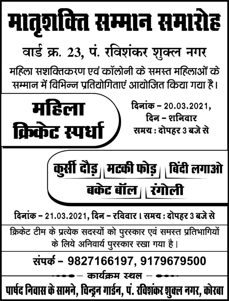 पंडित रविशंकर शुक्ल नगर विकास समिति के युवा कार्यकर्ताओं द्वारा महिला शशक्तिकरण के लिए महिला सम्मान समारोह का आयोजन एवं शुभारंभ वार्ड पार्षद अब्दुल रहमान ने 20.01.2021 को किया ।जिसमें केवल वार्ड के ही नही अपितु कोरबा शहर के अनेक महिला क्रिकेट टीमो ने भाग लिया।आयोजन केवल दो दिवसीय ही था परंतु मातृशक्ति की रुचि एवं सहभागिता को देखते हुए समिति ने इसे और बढ़ा दिया है। शुभारंभ समारोह में कपिलेश्वर महिला मंडल 1 & 2, रविशंकर 11 {RSK},एडुकेशन 11 एवं एडवोकेट 11 की टीमों ने भाग लिया। मुख्य अतिथि के रूप में श्री दुर्गेश शर्मा जी नगर कोतवाल, श्री नॉशाद खान चीफ ब्यूरो नवभारत समाचार पत्र,,स्वयंसेवी श्रीमती सुधा झा,वार्ड क्रमांक 24 पार्षद श्रीमती सिमरन जीत कौर जी, वरिष्ट अधिवक्ता श्री अशोक तिवारी,माँ पीताम्बरा कोल कंपनी के महाप्रबंधक श्री सुनील नेहरा,अर्थ कोन कंपनी के संचालक श्री मोहम्मद शफी,वरिष्ठ अधिवक्ता श्री बी.के.शुक्ला, श्री रणधीर सिंह, प्रचार्य शा उच्च विद्यालय,श्री नॉशाद खान ,श्री वेद यादव ,श्री कश्यप, श्री के.के.तिवारी स्टेशन मास्टर रेलवे जी उपस्थित रहे।