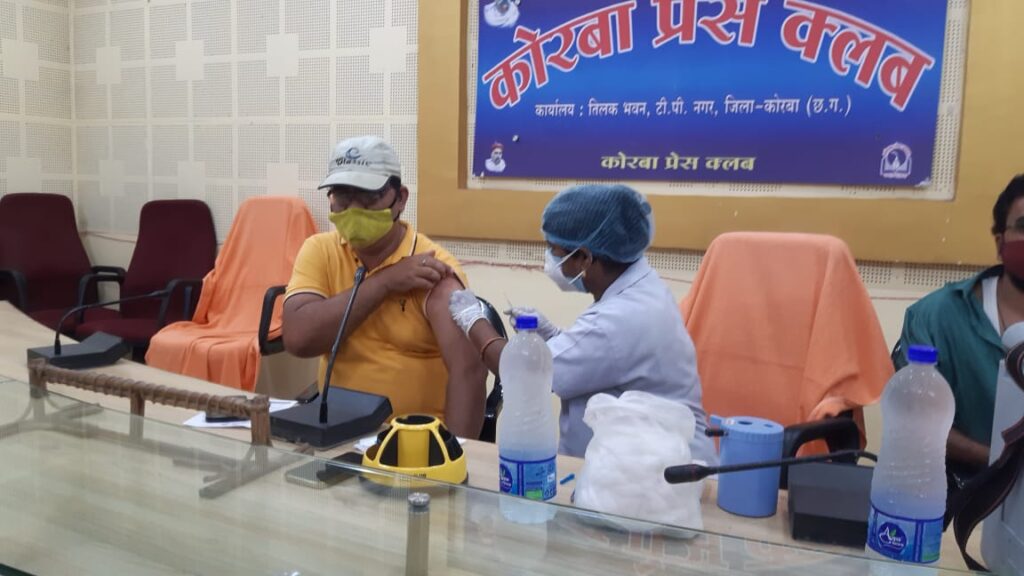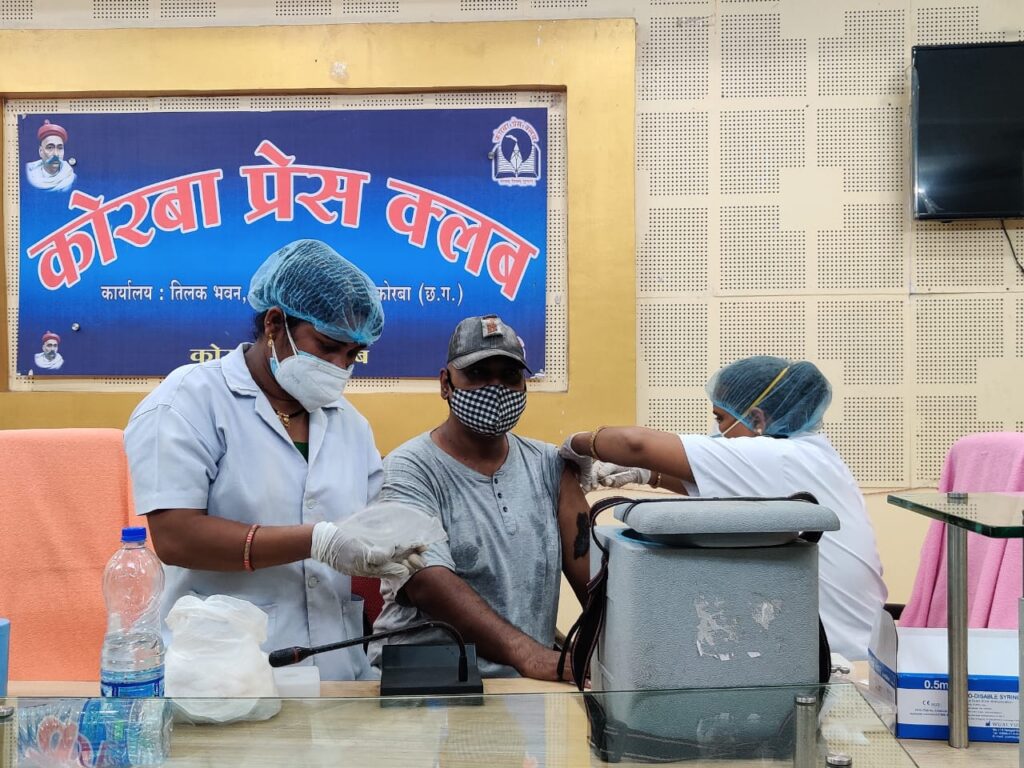 नमस्ते कोरबा :: राज्य सरकार द्वारा प्रदेश के पत्रकारों को फ्रंट लाईन वर्कर घोषित करने के बाद आज कोरबा जिला मुख्यालय में करीब 200 पत्रकारों और उनके परिजनों को कोरोना से बचाने के लिए टीका लगाया गया। मुख्य चिकित्सा एवं स्वास्थ्य अधिकारी डॉ. बीबी बोर्डे के मार्गदर्शन व कोरबा प्रेस क्लब के सहयोग से 18 से 44 वर्ष की उम्र के लोगों का टीकाकरण प्रेस क्लब तिलक भवन में कराया गया। कोविड वैक्सीनेशन कराने के लिए उत्साहपूर्वक लोगों ने आवश्यक दस्तावेजों के साथ यहां पहुंचकर कोरोना संक्रमण से रक्षा के लिए टीका लगवाया।