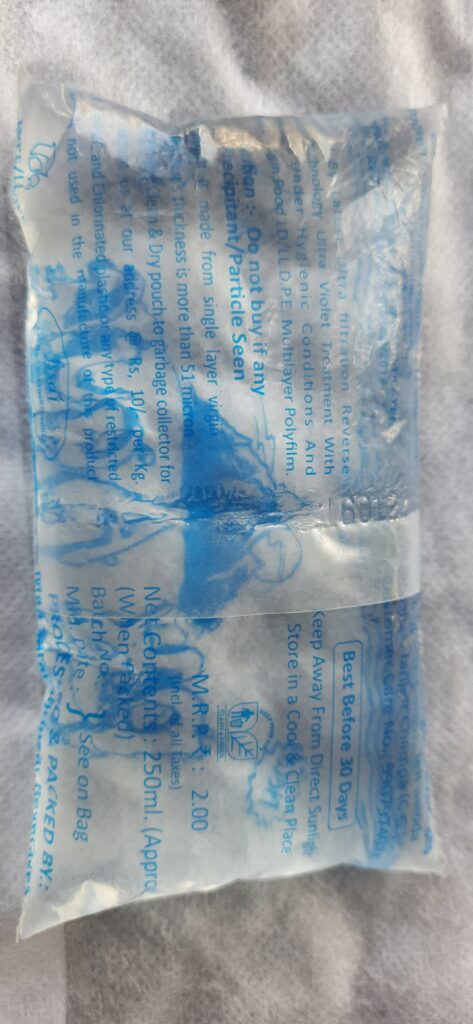 व्यापारी से खरीदने के बाद स्थानीय रिटेलर द्वारा भी इनके रखरखाव को लेकर सावधानी नहीं बरती जाती तथा पानी पाउच के बोरों को फ्रीजर की बजाए दुकान के कोने में पटक दिया जाता है।फूड सेफ्टी विभाग के अफसर नहीं करते कार्रवाई इसलिए गली-गली में खुल गईं पाउच की फैक्टरी किसी नियम का पालन नहीं नियमानुसार प्रत्येक पानी पाउच में पैकिंग की तिथि, पैकिंग समाप्ति की तिथि (एक्सपायरी डेट), आरओ तथा फिल्टर है या नहीं इसकी जानकारी, पानी में शुद्धता का मानक, पैकिंग नंबर, पैकिंग के स्थान का नाम व पता आदि जानकारी लिखना आवश्यक है जो बाजार में बिक रहे अधिकांश पानी पाउच में नहीं होती। शुद्धता का कोई पैमाना न होने की वजह से इन पाउच से मच्छर, कीड़े, कचरा निकलना साधारण बात हो गयी है।अशुद्ध पानी बेखौफ बेच रहेअधिकांश पाउच का पानी पंप से ही निकाला गया लोकल पानी होता है। इस पानी को न तो फिल्टर किया जाता है और न ही इसकी पैकिंग वाली पालिथीन ही क्वालिटी की होती है। अमूमन इस तरह के एक पानी पाउच की कीमत अधिकतम 50 पैसे होती है जिसे दुकानदारों द्वारा दो से ढाई रु़पए मैं बेखौफ होकर बेच रहे हैं।