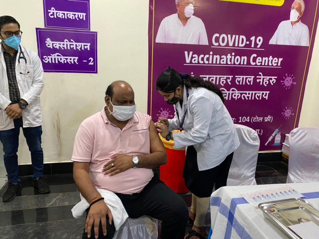 16 जुलाई रायपुर 2021-आज माननीय मंत्री राजस्व एवं आपदा प्रबंधन श्री जयसिंह अग्रवाल ने कोरोना से लड़ने एवं रोकथाम हेतु कोरोना टिका का प्रथम डोज प्रदेश के सबसे बड़े अस्पताल पण्डित जवाहर लाल नेहरू चिकित्सालय एवं चिकित्सा महाविद्यालय रायपुर में लगवाये। मंत्री जयसिंह अग्रवाल ने प्रदेशवासियो को सन्देश देते हुए कहा कि सभी को जागरूक नागरिक का परिचय देते हुए जल्द से जल्द कोरोना का टिकाकारण कराना चाहिए ताकि कोरोना के गभीर परिणाम से बचा जा सके।