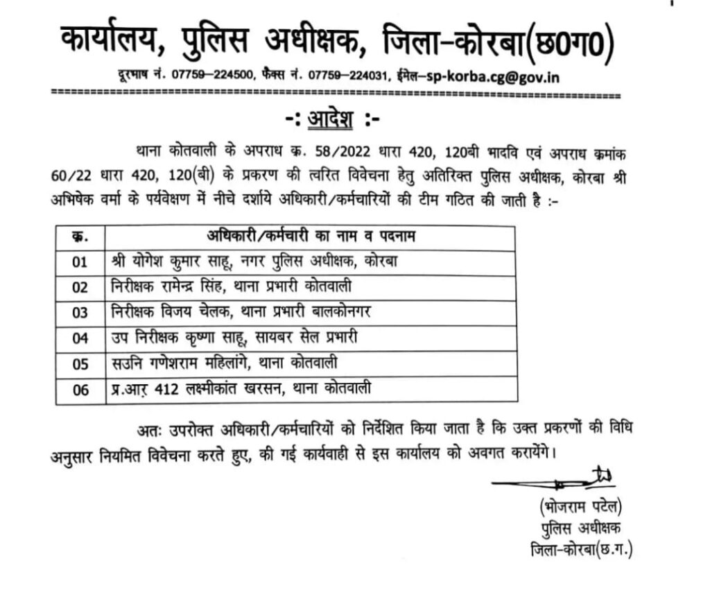 नमस्ते कोरबा :-कोरबा एसपी भोजराम पटेल ने हरदी बाजार तरदा बाईपास एवं चांपा उरगा कोरबा छुरी कटघोरा फोरलेन सड़क निर्माणमें आने वाले भूमि का अधिग्रहण हेतु अधिसूचना जारी होने के बावजूद भी षड्यंत्र पूर्वक भूमि का छोटे-छोटे टुकड़ों में क्रय विक्रय कर अधिक मुआवजा प्राप्त कर शासन को आर्थिक क्षति पहुंचाने के प्रयास करने के मामले में थाना कोतवाली कोरबा में दर्ज अपराध के विवेचना हेतु विशेष टीम का गठन किया है। कोरबा जिले में तरदा-हरदीबाजार और पतरापाली से कोरबा के मध्य निर्मित होने वाले क्रमशः फोरलेन एवं नेशनल हाईवे-130 के लिए जमीन का अधिग्रहण और मुआवजा के मामले में जांच तेज हो गयी है। रोक लगाने के बाद भी फोरलेन व नेशनल हाईवे के मार्ग में आने वाले जमीनों को ज्यादा मुआवजा के लिए अनेक छोटे-छोटे टुकड़ों में रजिस्ट्री करने/कराने की जांच अब पुलिस की विशेष टीम करेगी। कोतवाली में अपराध क्र. 58/2022 एवं 60/2022 पर पृथक-पृथक अपराध धारा 420, 120 बी के तहत दर्ज किया गया है। जनवरी माह में दर्ज हुई इन दोनों एफआईआर के बाद जांच में तेजी लाई गई है। पुलिस अधीक्षक भोजराम पटेल ने दोनों प्रकरणों की त्वरित विवेचना के लिए एएसपी अभिषेक वर्मा के पर्यवेक्षण में 6 सदस्यीय टीम गठित की है। इस टीम कोरबा सीएसपी योगेश कुमार साहू, थाना प्रभारी कोतवाली रामेन्द्र सिंह, बालको थाना प्रभारी विजय चेलक, सायबर सेल प्रभारी एसआई कृष्णा साहू, एएसआई गणेशराम महिलांगे एवं प्रधान आरक्षक लक्ष्मीकांत खरसन को शामिल किया गया है।