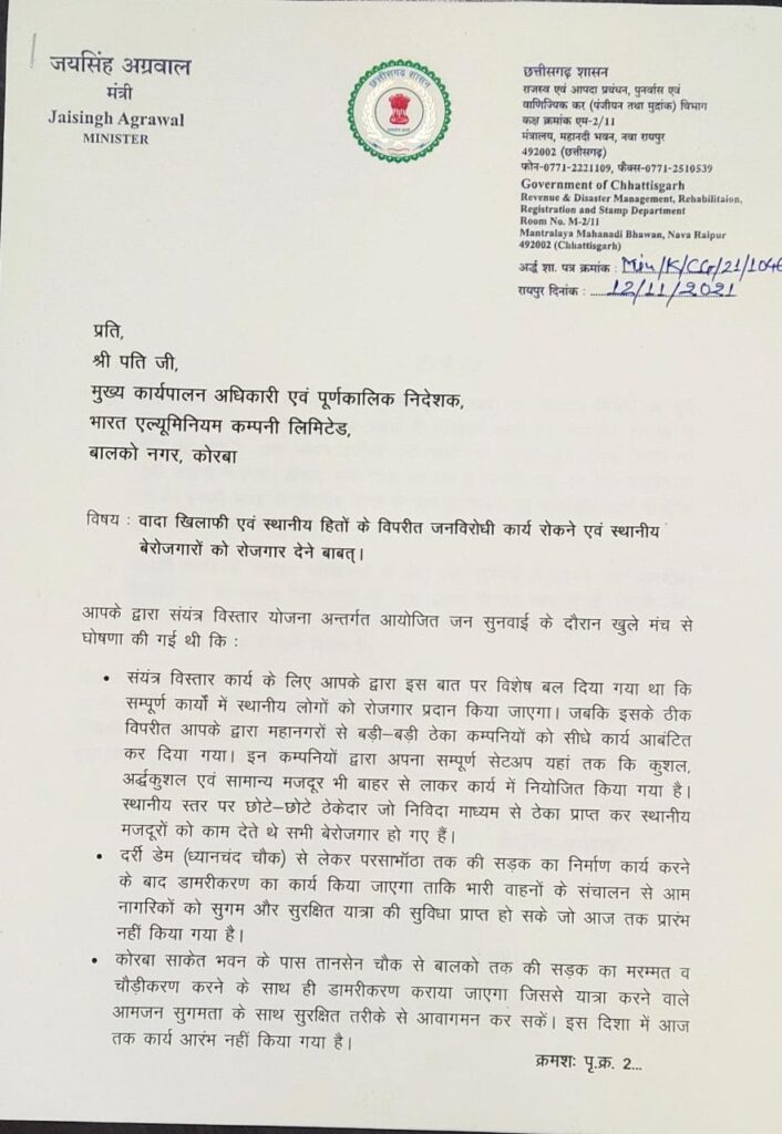 राजस्व मंत्री द्वारा बालको सी.ई.ओ. को लिखे गए पत्र में स्पष्ट तौर पर कहा गया है कि यदि बालको प्रबंधन अपने रवैये में बदलाव लाते हुए किए गए वायदों को पूरा करने की पहल नहीं करता है तो स्थानीय समुदाय से उसे उग्र आंदोलन का सामना करना पड़ सकता है जिसके परिणामस्वरूप संयंत्र में तालाबंदी की स्थिति भी आ सकती है। जयसिंह अग्रवाल ने जन सुनवाई के दौरान बालको प्रबंधन द्वारा किए गए बहुत से वायदों में से जिन प्रमुख बिन्दुओं को तत्काल पूरा करने के लिए पत्र लिखा है उनमें से प्रमुख रूप से स्थानीय बेरोजगारों को रोजगार उपलब्ध कराने के बिन्दु पर राजस्व मंत्री ने लिखा है कि संयंत्र विस्तार कार्य के लिए बालको द्वारा इस बात पर विशेष बल दिया गया था कि सम्पूर्ण कार्यों में स्थानीय लोगों को रोजगार प्रदान किया जाएगा। जबकि इसके ठीक विपरीत बालको द्वारा महानगरों से बड़ी-बड़ी ठेका कम्पनियों को सीधे कार्य आबंटित कर दिया गया। इन कम्पनियों द्वारा अपना सम्पूर्ण सेटअप यहां तक कि कुशल, अर्द्धकुशल एवं सामान्य मजदूर भी बाहर से लाकर कार्य में नियोजित किया जा रहा है।