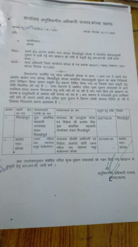 नमस्ते कोरबा :-: गौरतलब है कि जिले में संचालित जो सरकारी राशन की दुकानों में गड़बड़ी मिलने के बाद अनुविभागीय अधिकारी ने 50 लाख का आरआरसी जारी करते हुए राशि जमा करने नोटिस जारी किया है; शहरी क्षेत्र की दो दुकानों के लिए वसूली प्रकरण भेजा गया है जिनमें मुख्य रुप से तुलसी नगर यानी साकेत नगर में एकता स्व सहायता समूह के नाम से संचालित सहकारी उपभोक्ता भंडार के संचालक श्रीमती शशि रानी विकृत आकाश खत्री पर सरकारी चावल को बेचकर 20 लाख 72 हजार ₹597 का गबन करने का आरोप है , जिसमें जांच के बाद उपभोक्ता भंडार में चावल स्टॉक कम होने पर खाद्य विभाग ने गड़बड़ी की सूचना एसडीएम कार्यालय को दी थी गड़बड़ी उजागर होने के बाद दुकान संचालक श्रीमती शशि रानी को हटाकर दूसरे को दे दिया गया है; इस कार्यवाही से डरकर संचालिका शशि रानी एवं उसके परिवार के द्वारा खाद्य विभाग के ऊपर में झूठे आरोप लगाकर फिर दुकान आवंटन कराने के लिए दबाव बनाया जा रहा है इतना ही नहीं उनके द्वारा विभिन्न सोसायटीओं के अन्य संचालकों पर भी अनर्गल आरोप लगाया जा रहा है कि आप लोगों की वजह से मेरी सोसाइटी बंद हुई है सबको देख लूंगा या कभी बीमारी का बहाना बनाया जा रहा है; कार्यवाही से बचने के लिए उनके द्वारा अनशन तक का सहारा लिया जा रहा है, उक्त व्यक्ति परिवार सहित कई बार अनशन पर भी बैठ चुका है यहां तक की फर्जी तरीके से शपथ पत्र देकर भी आगे ऐसा नहीं करने की दुहाई दे रहा है, संचालक के द्वारा किए जा रहे कृत्य से यह प्रतीत होता है कि वह गबन की राशि सरकार को वापस करने की मंशा नहीं रखते