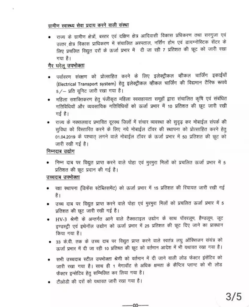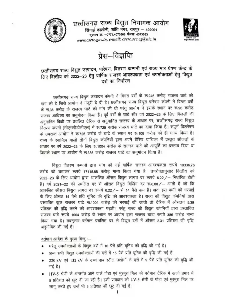 छत्तीसगढ़ बिजली नियामक आयोग ने बिजली की नई दरें घोषित कर दी हैं। घरेलू बिजली की दरों में 10 पैसे प्रति यूनिट की वृद्धि की गई है, वहीं उद्योगों के लिए बिजली की दर में 15 पैसे प्रति यूनिट की वृद्धि की गई है। वहीं, पोहा और मुरमुरा के लिए 5 प्रतिशत की छूट दी गई है।