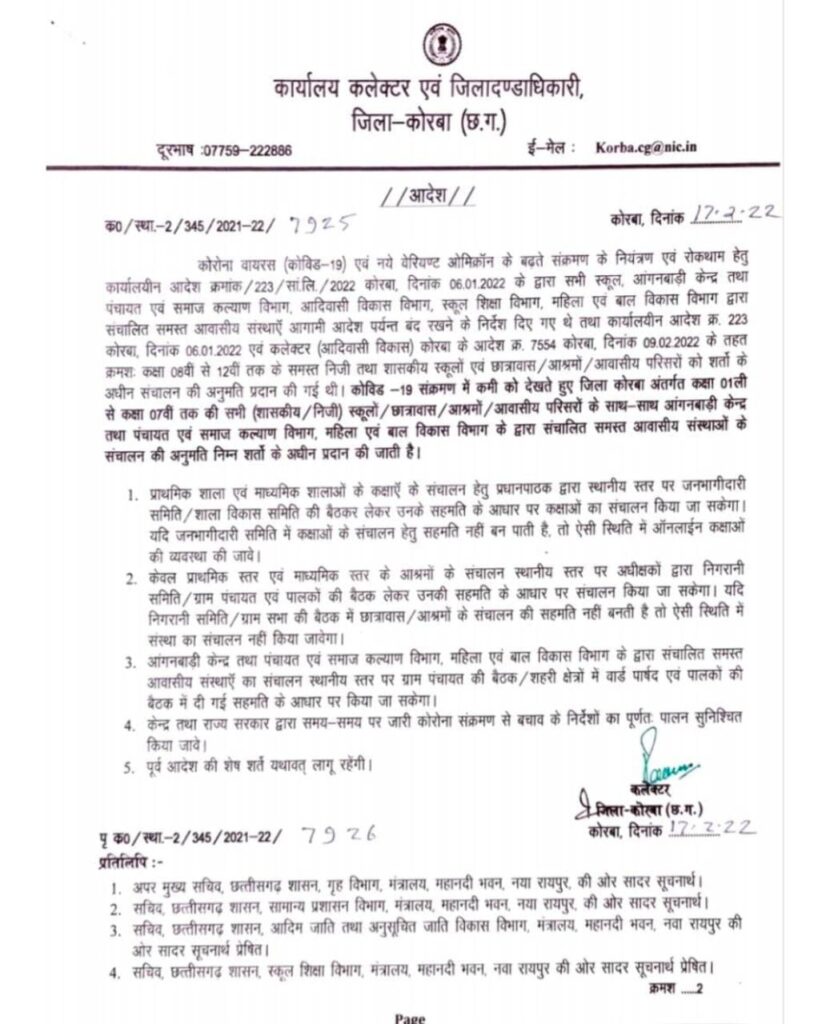 नमस्ते कोरबा ब्रेकिंग:- जिले में कोरोना की काम होती रफ़्तार को देखते हुए जिला कलेक्टर ने कोरबा जिले के अंतर्गत कक्षा 01 से कक्षा 07 वीं तक सभी स्कूलों को संचालन की अनुमति दे दी है। आपको बता दें कि कक्षा 08 से 12 वीं तक पहले ही अनुमति प्रदान की जा चुकी है।