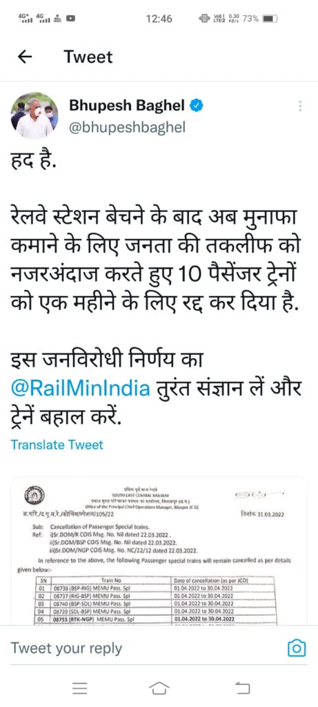 10 पैसेंजर ट्रेन रद्द्द्द होने पर मुख्यमंत्री भूपेश बघेल ने केंद्र सरकार पर कसा तंज