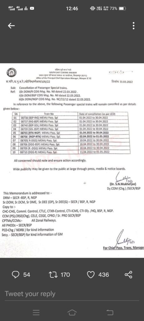 नमस्ते कोरबा :- रेलवे के सबसे कमाऊ पूत दक्षिण पूर्व मध्य रेलवे जोन द्वारा 10 पैसेंजर ट्रेनें एक महीने के लिए बंद करने पर मुख्यमंत्री भूपेश बघेल ने नाराजगी जताई है। मुख्यमंत्री ने सोशल मीडिया पर तल्ख शब्दों में लिखा है… हद है. रेलवे स्टेशन बेचने के बाद अब मुनाफा कमाने के लिए जनता की तकलीफ को नजरअंदाज करते हुए 10 पैसेंजर ट्रेनों को एक महीने के लिए रद्द कर दिया है। इस जनविरोधी निर्णय का रेल मंत्री संज्ञान लें और ट्रेनें बहाल करें,