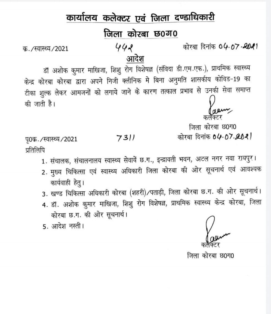 नमस्ते कोरबा :: कोरबा में कोरोना वैक्सीन की कालाबाजारी करने वाले डाॅ.अशोक माखिजा की कलेक्टर ने डीएमएफ से छुटटी कर दी है। कोरबा कलेक्टर रानू साहू ने 24 घंटे के भीतर ही मामले की जांच के बाद दोषी डाॅक्टर के खिलाफ बड़ी कार्रवाई करते हुए, ये संकेत दे दिये है कि स्वास्थ के क्षेत्र में लापरवाही बिल्कुल भी बर्दाश्त नही की जायेगी। इसकी जानकारी सामने आने के बाद कलेक्टर रानू साहू ने इस पूरे मामले में गहरी नाराजगी व्यक्त की थी। कलेक्टर ने मामले की गंभीरता को देखते हुए वैक्सीन की कालाबाजारी पर सख्त कार्रवाई की बात कही थी, और पूरे प्रकरण की जांच का जिम्मा एसडीएम सुनील नायक को सौंपा गया था।कलेक्टर के आदेशानुसार एसडीएम सुनील नायक शनिवार की सुबह से सीएमएचओं कार्यालय में डेरा डालकर दोषी डाॅक्टर अशोक माखीजा सहित स्वास्थ विभाग के जिम्मेदार लोगो का बयान दर्ज किया गया था। देर शाम एसडीएम ने जांच रिपोर्ट कलेक्टर रानू साहू के समक्ष प्रस्तुत कर दिया था। जिस पर कलेक्टर रानू साहू ने आज रविवार को छुटटी के दिन ही दोषी डाॅक्टर अशोक माखीजा की डीएमएफ से सेवा तत्काल प्रभाव से समाप्त करने का आदेश जारी कर दिया।