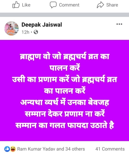 बता दें कि भाजपा पिछड़ा वर्ग मोर्चा के जिला महामंत्री दीपक जायसवाल ने सोशल मीडिया में ब्राम्हणों को बेचारा, दरिद्र जैसी संज्ञा देने के साथ-साथ यहां तक कह दिया है कि ब्राम्हणों को बेवजह प्रणाम करना बंद कर दें, देश, समाज सब सुधर जाएगा। बेवजह सम्मान देकर प्रणाम न करें, सम्मान का गलत फायदा उठाते हैं। भाजपा नेता की इस टिप्पणी को लेकर न सिर्फ ब्राम्हण समाज बल्कि दूसरे समाज के लोगों ने भी निंदा की है।