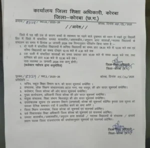 नमस्ते कोरबा। जिले में बढ़ती ठंड और बच्चों के स्वास्थ्य पर पड़ रहे प्रभाव को देखते हुए जिला शिक्षा अधिकारी ने सोमवार को सभी स्कूलों के समय में तत्काल प्रभाव से बदलाव का आदेश जारी किया है। यह आदेश जिले के सभी शासकीय, अशासकीय, अनुदान प्राप्त और मदरसा स्कूलों पर लागू होगा।