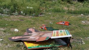 लेकिन मतदान के दिन पोलिंग बूथ से कुछ दूर बनाए गए टेंट में मतदान केेेेे दिन भाजपा और कांग्रेस के प्रत्याशियों के कट आउट एवं दोनों पार्टियों का झंडा लगाया गया था. जो वर्तमान में कचरे के ढेर पर पड़ा है. जिस पर ना तो सफाई कर्मियों की नजर पड़ रही है और ना ही तथाकथित नेताओं की जो इस मार्ग से हर रोज जाना जाना कर रहे हैं.पार्टी का झंडा जो हर कार्यकर्ता का मान सम्मान होता है, पार्टी के कार्यकर्ताओं को इसका सम्मान बनाए रखना चाहिए. मतदान की समाप्ति के पश्चात सम्मान पूर्वक टेंट से इन्हेंं उतारकर यथा उचित स्थान पर रखना चाहिए था.