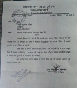 नगर पंचायत छुरीकला के मुख्य नगर पालिका अधिकारी द्वारा जारी पत्र में कहा गया है कि उपअभियंता द्वारा प्रस्तुत बिल के आधार पर 11 फरवरी 2026 को देयक का लेखा परीक्षण कर कार्यालय अवधि में शत-प्रतिशत भुगतान की कार्रवाई की जाएगी। पत्र में ठेकेदार से अटल परिसर के सामने जारी आमरण अनशन तत्काल समाप्त करने का आग्रह भी किया गया है।