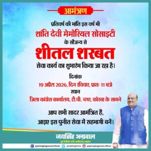 उक्त जानकारी देते हुए शांति देवी मेमोरियल सोसाइटी के पीआरओ सुरेश कुमार अग्रवाल ने बताया कि शीतल शरबत का निःशुल्क वितरण अप्रैल से जून माह तक किया जावेगा, जिसका शुभारंभ 19 अप्रैल 2026, दिन रविवार को प्रातः 11 बजे, पूर्व मंत्री जयसिंह अग्रवाल के मुख्य आतिथ्य में किया जावेगा ।