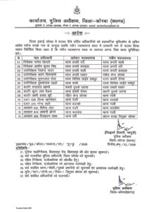 जारी आदेश के मुताबिक निरीक्षक नागेश तिवारी को दर्री से पाली थाना प्रभारी बनाया गया है, वहीं निरीक्षक आशीष कुमार सिंह को करतला से दर्री थाना प्रभारी की जिम्मेदारी दी गई है। उपनिरीक्षक जितेन्द्र यादव को पाली से करतला, श्रवण विश्वकर्मा को पसान से रक्षित केंद्र कोरबा तथा सुमनलाल पायरा को सिविल लाइन रामपुर से लेमरू थाना प्रभारी बनाया गया है।