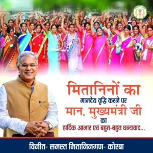 उन्होंने मितानिनों को शुभकामनाएं और बधाई देते हुए कहा कि कार्य के प्रति आपकी समर्पित भावनाओं का सम्मान मिला है। निश्चित ही मानदेय में वृद्धि से आर्थिक लाभ और आवश्यकताओं की पूर्ति होगी। उन्होंने कहा कि मितानिनों द्वारा घर-घर जाकर स्वास्थ्य के क्षेत्र में कार्य किया जाता है वह अपने आप में महान कार्य है। गर्भवती माताओं का पंजीयन, संस्थागत प्रसव, शिशुओं का टीकाकरण, गैर संचारी व संचारी रोगों के रोकथाम सहित अन्य विभिन्न कार्यों में मितानिनों का महत्वपूर्ण योगदान होता है, जो एक अति महत्वपूर्ण कार्य है।