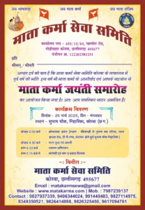 माता कर्मा सेवा समिति ने समाज के सभी लोगों को सपरिवार सादर आमंत्रित करते हुए अपनी भागीदारी सुनिश्चित करने का अनुरोध किया है। कार्यक्रम को भव्य स्वरूप प्रदान करने के लिए समाज के लोग उत्साह से जुटे हुए हैं।