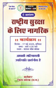 नमस्ते कोरबा : भारतीय सेना द्वारा चलाये गये ‘‘आपरेशन सिन्दूर‘‘ की सफलता तथा भारतीय सेना के सम्मान में राष्ट्रीय सुरक्षा के लिये नागरिक कार्यक्रम का आयोजन 17 मई को शाम 4.30 बजे घंटाघर चौक निहारिका में किया गया है। इस अवसर पर भारतीय सेना के सम्मान में तिरंगा यात्रा भी निकाली जायेगी।