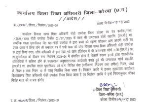 नमस्ते कोरबा :- स्कूल में बच्चों को पढ़ाने के बजाय राजनीतिक दल का प्रचार प्रसार करने ,लोक सेवा केंद्र चलाकर गैर शिक्षकीय कार्य करने वाले जिले के दो अनुशासनहीन शिक्षकों पर निलंबन की गाज गिरी है। डीईओ ने दोनों लापरवाह विकासखण्ड पोंडी उपरोड़ा के शासकीय प्राथमिक शाला घुमानीडांड में पदस्थ सहायक शिक्षक (एल.बी.) जगतपाल कोर्चे एवं विकासखण्ड कोरबा के शासकीय प्राथमिक शाला कल्दामार में पदस्थ सहायक शिक्षक (एलबी) कंशराम पैकरा को निलंबित कर दिया है। कार्रवाई से महकमे में हड़कम्प मचा है।